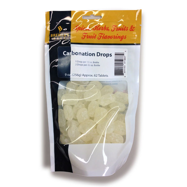 • Carbonation drops are a unique and easy way to evenly carbonate your beer without messing with priming sugar. They look like lemon drop candy and are a mixture of glucose and sucrose. Simply add one drop per 12 oz bottle or two drops per 22 oz bottle at bottling time and shake to ensure dissolution. Beer will carbonate as normal without the hassle of measuring out priming sugar, boiling, cooling and adding to the bottling bucket. Each package contains approximately 60 drops. These carbonation drops are simple, easy to use, and effective!