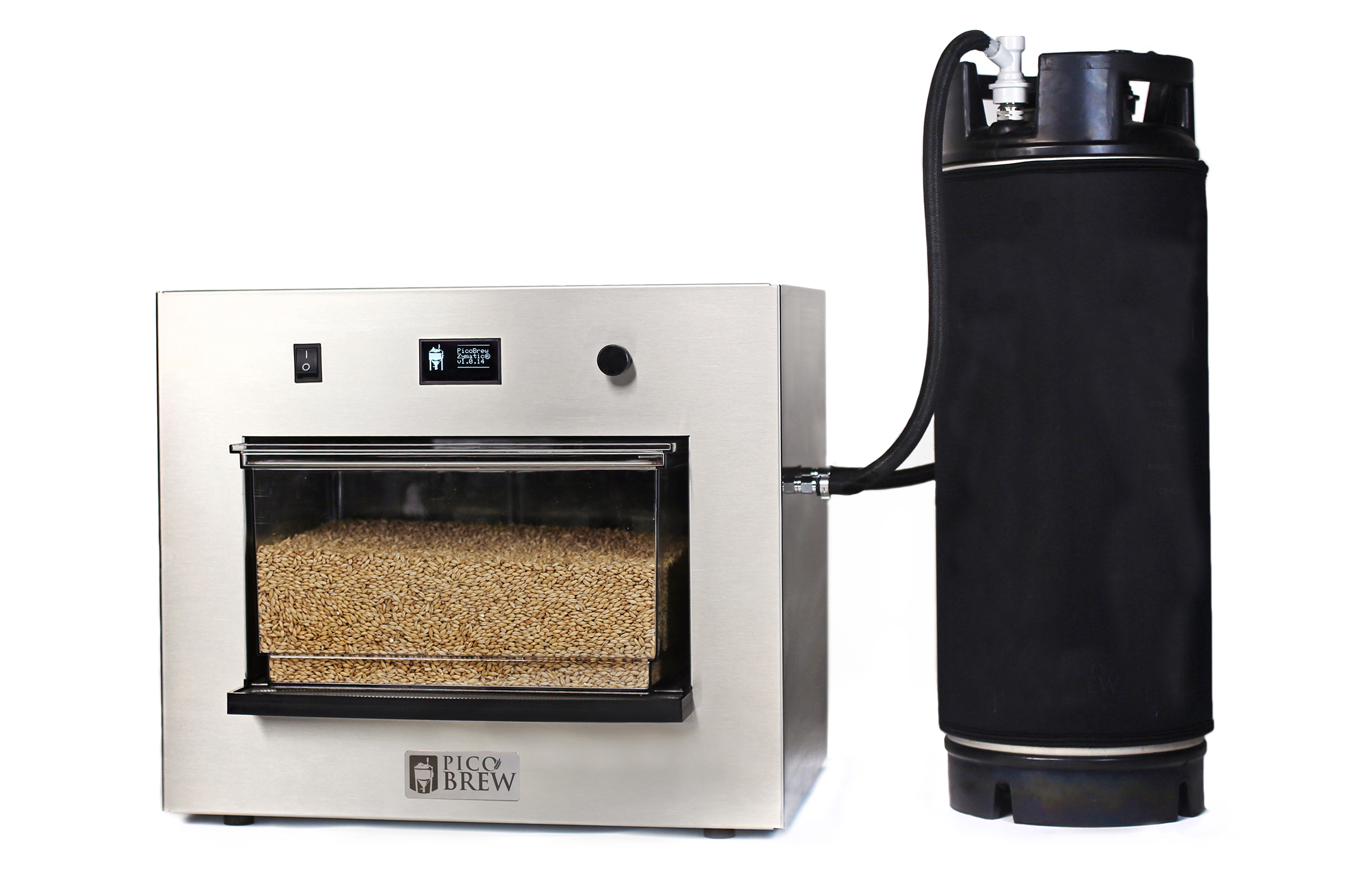 A fully automated, all-grain, homebrewing appliance that allows the user to brew top quality craft beer across all styles at the push of a button. Comes included with the specialized 5 gallon keg you need and is shipped free by MoreBeer! in the lower 48 states from MoreBeer! The PicoBrew Zymatic® allows for efficient and accurate home-brewing, without all of the clean-up. There are numerous reasons why we at MoreBeer! really like this new all grain brewery, but we recognize it may not be for everyone. We've found that the Zymatic really shines if:,,,You're wanting extreme repeatability.  The Zymatic can remember individual batches, and if you want to replicate one, its as easy as loading up the same ingredients and selecting that brew.  Not only great for repeating amazing homebrew, this is sure to become an essential pilot system for breweries across the world.,,,You want to brew all grain, but are restricted on space.  This unit is extremely compact, making space almost a non-factor when compared to traditional all grain setups.  Our first trial brew on these units took place on one of our desks during a work day!,,,Time is an issue.  Set up and clean up are much quicker and easier, and since the Zymatic is completely automated, you don't need to be there to monitor temperatures, open valves, turn on burners, etc.,,,Easy - It really is the easiest way to brew all-grain beer at home. ,The Zymatic® can brew up to 2.5 gallons of wort across a wide range of brewing styles.  Depending on the grain load, style and mill, and the mash schedule, you get 70- 90% brewing efficiencies with the Zymatic®.  Our recipes work great on the PicoBrew, however since they're sized for 5.5 gallons, you'll be able to brew twice! ,Features,,,Internet connected via Wi-Fi or Ethernet,,,Powerful, predictive, custom recipe creation software,,,Easy to clean with dishwasher safe components,,,All-grain and extract brewing,,,Average of four hours from start to finish,,,Brews up to 1.090 gravity beers without adjuncts,,,Supports 4 different timed hops additions,,,1500W heating element,,,Power required: 120 v,,,2.5 gal wort output,Brewing Process,,,Choose a recipe: Create (or borrow) a recipe, then select the recipe to brew by using the selector knob on the front panel of your PicoBrew Zymatic®.,,,Fill your keg: Fill a 5 gal Cornelius keg with water and attach the hoses on the side of your Zymatic to the keg posts.,,,Add your grain and hops: Add your grain to the main compartment of the step filter and add hops (per the recipe) into the appropriate hop cages that insert into the step filter.  Slide the step filter into the machine and you’re all ready to brew!,,,Brew: As your Zymatic® begins mashing you can watch the progress of your brew via your Pico Brew account from your PC, tablet, or phone.  In about 3 and ½ hours your keg will contain beer wort (unfermented beer).,,,Add yeast and ferment: Detach the keg from the machine by removing the hoses from the keg posts, and chill the keg to the necessary pitching temperature.  Pitch yeast and then seal the keg with an air-lock keg lid.  Your beer will ferment in the keg you brewed it in within 5 days to 2 weeks.,,,Transfer: Depending on your desired serving method, take your finished beer and bottle it or place it in a kegerator to keep it chilled.,,,Enjoy: Drink up!,PicoBrew Software,With a web-based recipe crafter and Wi-Fi/Ethernet connectivity, creating a recipe and beginning the brewing process is a cinch. The highly customizable recipe crafter with its predictive calculations allows for ease of recipe creation for specific IBU and OG benchmarks.,Includes: 120 v PicoBrew Zymatic® machine, step filter with hop cages and filter beds, ball lock connection hoses, 5 gal new Ball Lock Cornelius keg w/ shortened dip tube.  Unit Dimensions: 20.5 x 14.5 x 17 inches.  50 lb unit weight.